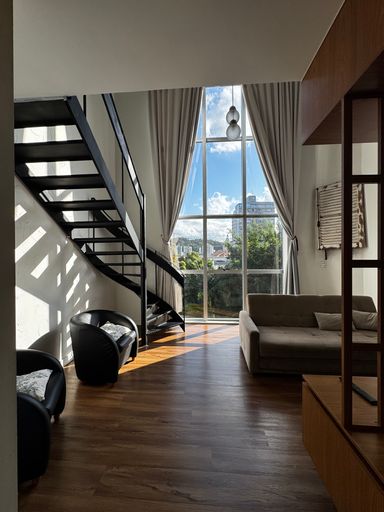 FLAT em área central! ✔️60m² de área privativa ✔️Banheira de hidromassagem ✔️Ficam os móveis das fotos ✔️Aparelho de ar condicionado ✔️Pé direito duplo na sala ✔️Residencial c/ elevador