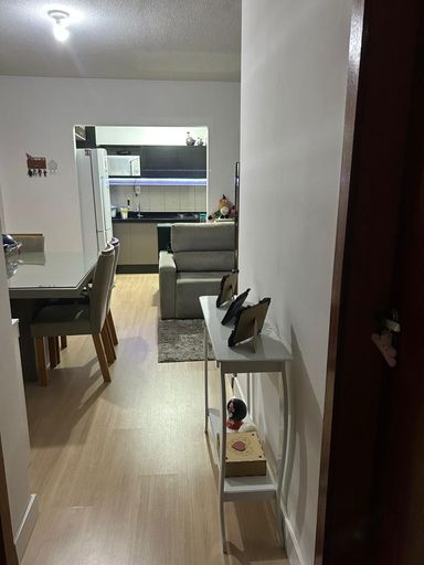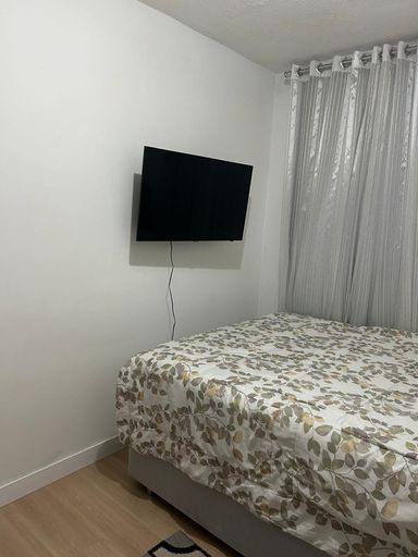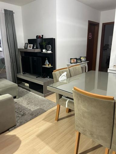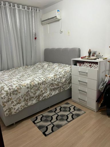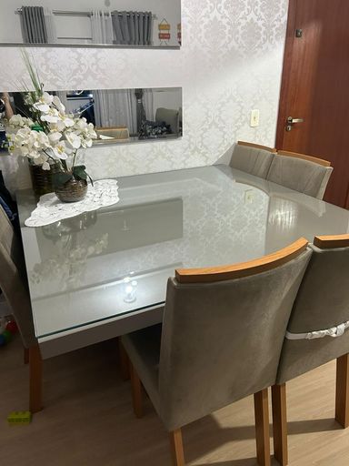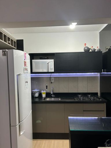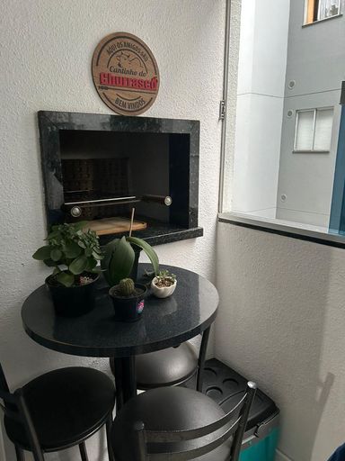 Permanece no imóvel cozinha planejada com mesa de jantar, fogão cooktop, mesa com cadeiras na área da churrasqueira e 01 ar-condicionado no quarto do casal.