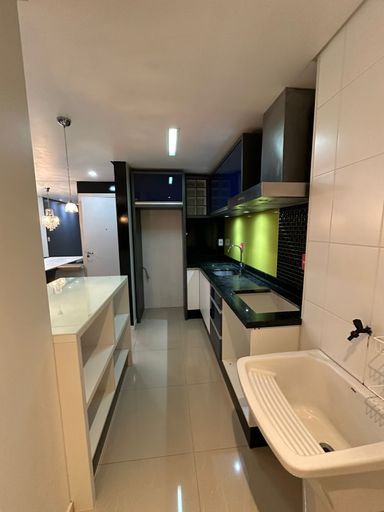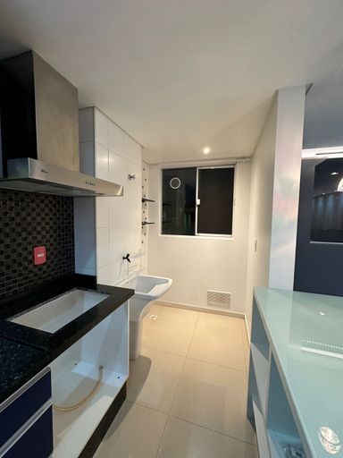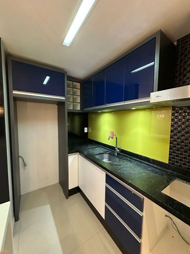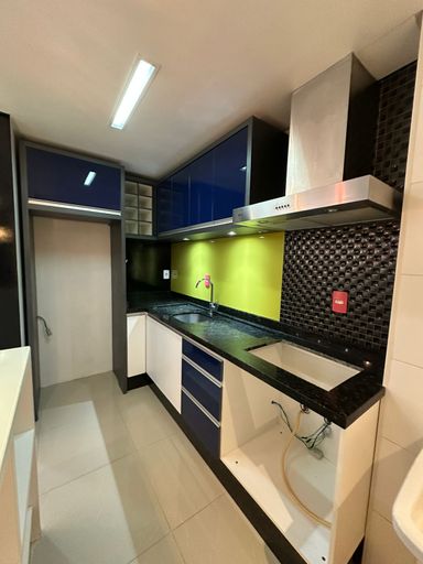 - Cozinha com bancada em mármore, coifa e móveis sob medida;