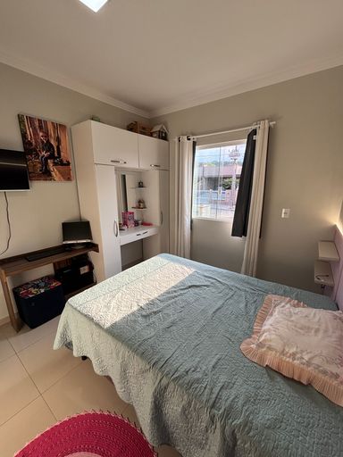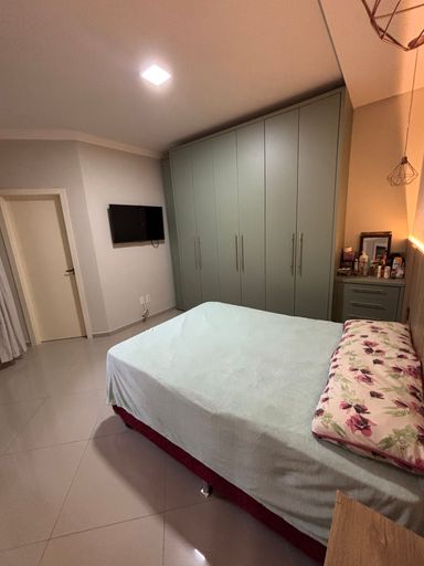 - Suíte com móveis planejados, roupeiro, cabeceira, lustres e TV;