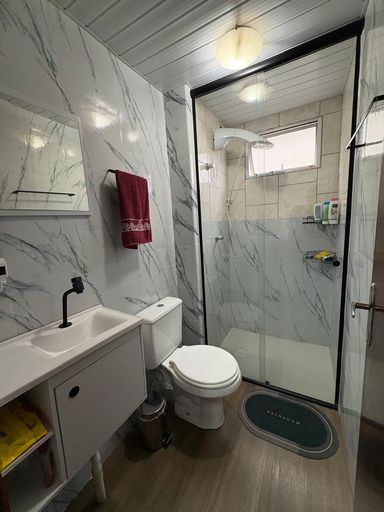 - o móvel do banheiro e o box de vidro
